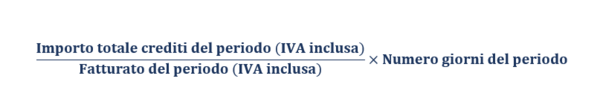 Questo metodo è basato sul rapporto tra crediti finanziari e vendite IVA inclusa. Si sceglie un periodo di osservazione (es. 30 o 90 giorni), e si usa la formula: