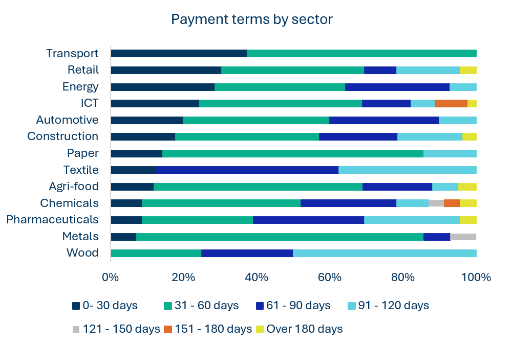 Dal punto di vista settoriale, legno, tessile e farmaceutico offrono i termini di pagamento medi più generosi, mentre il settore dei trasporti rimane più restrittivo.