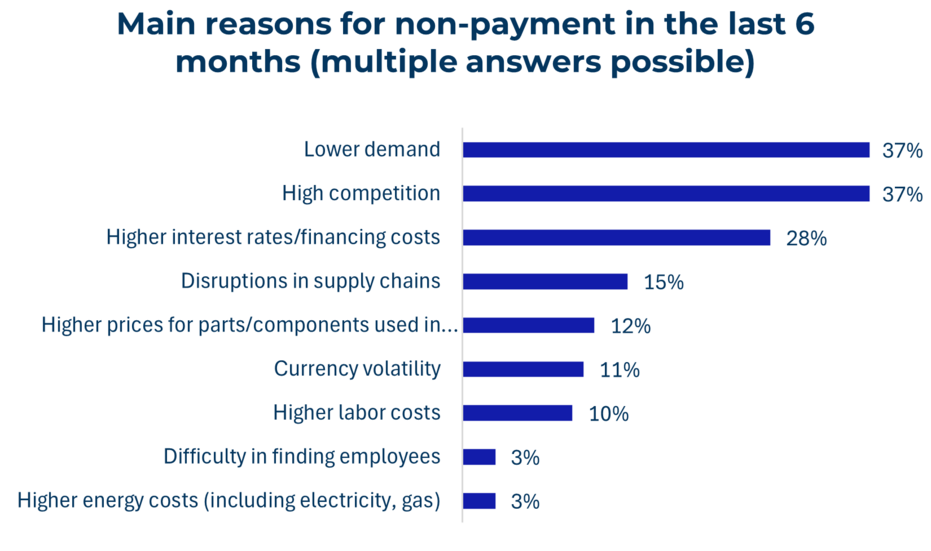 Argentina e Cile presentano le durate medie più brevi (26-27 giorni), rispetto ai 70 giorni medi dell’Ecuador. Le cause più frequentemente citate sono la domanda debole e la pressione in termini di concorrenza (37% ciascuna), seguite dagli elevati costi di finanziamento (28%). Le condizioni di credito restrittive, in particolare in Brasile e Colombia, continuano a limitare la capacità delle imprese di finanziare le proprie esigenze, aumentando così la loro esposizione ai ritardi di pagamento. Anche la volatilità dei tassi di cambio, i cambiamenti nelle politiche commerciali e l’aumento dei costi della manodopera si aggiungono ai vincoli tradizionali (concorrenza, tensioni geopolitiche).