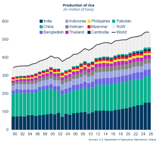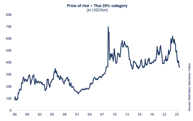 Dal 2022, l'India, principale esportatore mondiale, aveva limitato le vendite all'estero per contenere l'aumento dei prezzi globali (un incremento del 19% nel 2022 e 2023), legato in particolare alla guerra in Ucraina e alle condizioni meteorologiche sfavorevoli in Asia. La riapertura delle esportazioni nel 2024, unita a raccolti asiatici da record, ha portato a un calo dei prezzi del 35% in un anno. Considerate le previsioni di aumento della produzione per il 2026 e il possibile ritorno del fenomeno La Niña nel quarto trimestre del 2025, si prevede un crescente surplus di offerta nel 2026. I prezzi dovrebbero continuare a scendere almeno fino alla fine del 2025, con una probabile stabilizzazione nel 2026 a livelli che non si vedevano da dieci anni.